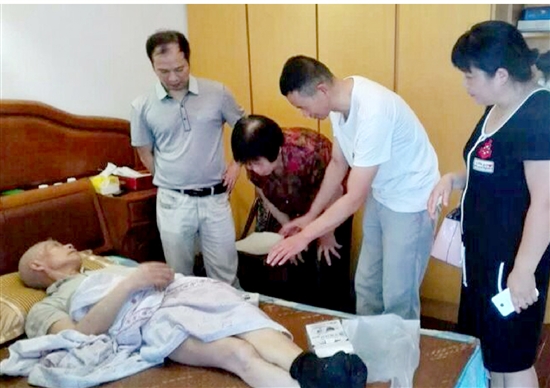 图为在龙川西路二弄徐老伯家,医生给卧床不起的徐老伯检查身体,并指导其老伴帮老伯进行肢体活动和按摩,防止患上褥疮。