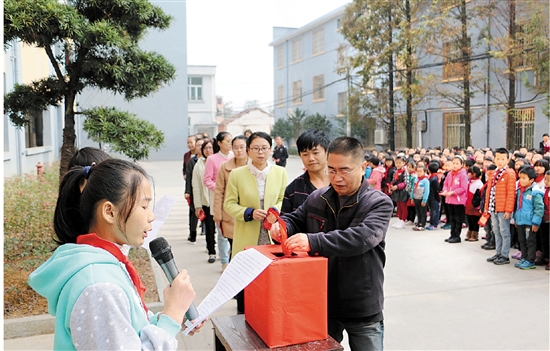 徐琛在教师队伍中,把一个装有500元爱心款的红包投进了募捐箱。六(1)班的王晨则在班级学生代表队伍中,把全班同学共同捐助的1065.5元爱心款放进了募捐箱。