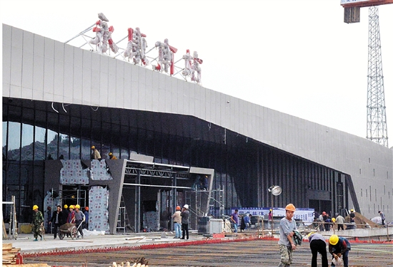 16日,记者在新金温铁路永康南站看到,站房已基本成形。工人们正在铺地砖,外立面装潢也在同时进行中。工程预计本月月底完工。