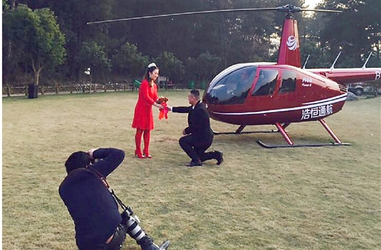 上月30日下午,在一场个性化的婚礼上,新郎用直升机接娶新娘,并乘坐直升机在城区上空飞行一周,最后直升机降落在云溪间酒店的草坪上。
