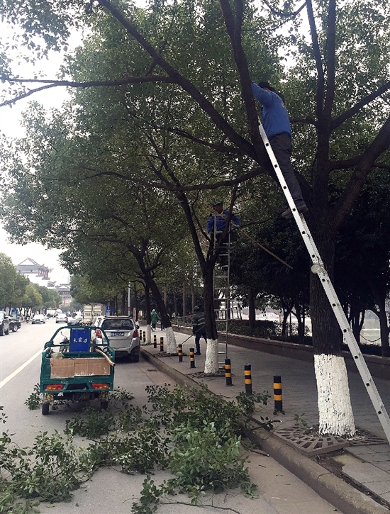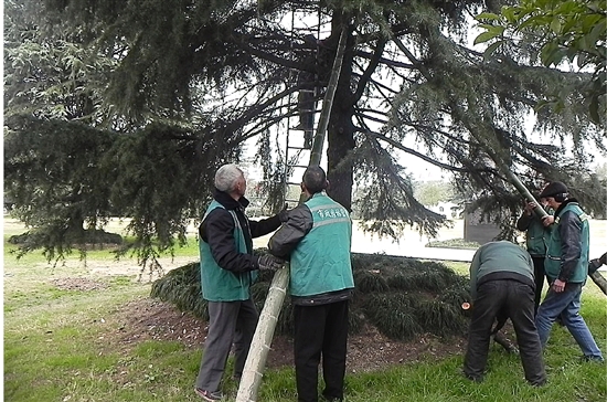 20日一大早,市城管执法局园林管理处的工作人员就在全市各公园、隔离绿化带上忙开了,他们用麻绳、竹竿对全市存在安全隐患的200多株雪松、塔柏等浅根性的苗木进行加固;对龙川中路、金城路等路段430多株枝叶茂密的行道树在不改变树木原状的前提下,进行再次疏空,并及时剪下树木枯死枝、病虫枝、风折枝,防止大雪来时,积雪压断树枝砸伤路人。