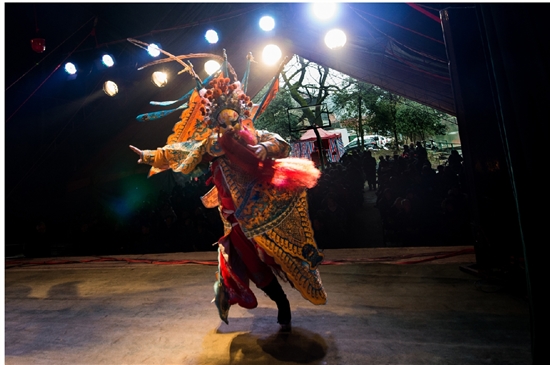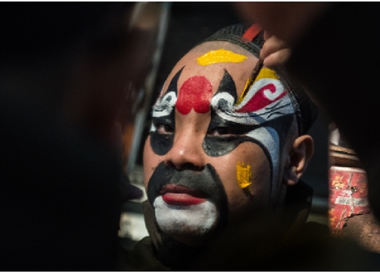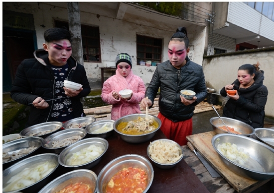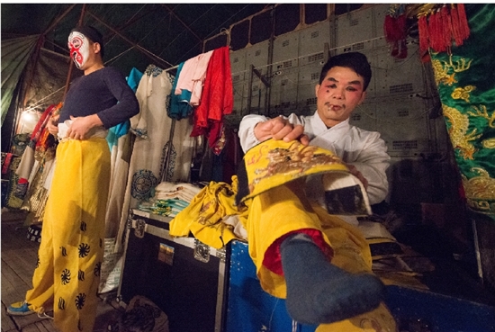 演出下午1点半开始,演职人员匆匆吃了午饭,就各自梳妆打扮忙碌开了。村头广场搭台唱戏,虽然条件非常简陋。但在后台,记者看到演员们化妆、表演一丝不苟,化妆、穿戴行头耗时一至二个小时。可演员们乐在其中,让我钦佩不已。