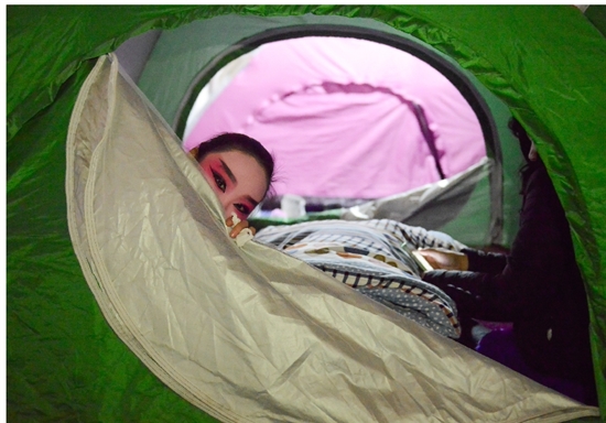 因为晚上还有演出,许多演员完成了下午的演出任务后,就不卸妆了,等待着晚上重上舞台,一展身手。在演出的间隙,演员们有的用手机发短信,玩游戏,有的用平板电脑观看下载下来的文艺节目,充实自己的文艺修养。晚上演出结束,要到10点半以后,演员们才能回帐篷休息。