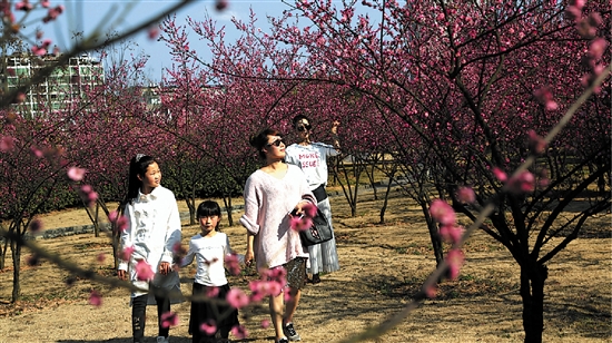 春节期间天气晴好,红梅盛开,三江六岸和公园里处处可见赏花的市民。
