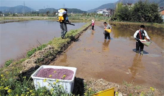 近日天气晴暖,正适合早稻播种。1日,龙山镇万古合作社的社员们正在田头播散种子。合作社负责人说,合作社500多亩早稻均采用直播方式,计划三五天内播种完毕。 记者 林群心 摄