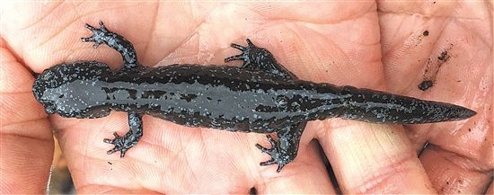 8日下午,吕静在家门口打扫卫生,在收拾一块废弃毛毯时发现了异常。在一块石头下,一个黑呼呼的小东西若隐若现。她用手拌开石块,一条身子如泥鳅、长有四只脚的小动物出现在她的面前。