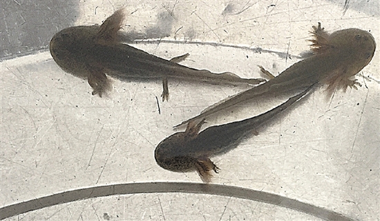细看这些“怪鱼”,全身呈灰褐色,有白色的小斑点,长约4厘米左右。再细看会发现它长着2条前肢和2条后肢,前肢和后肢都分别长出了趾。头与身体联接处还长有外鳃,外鳃部分呈现红色,在水中晃动十分好看。