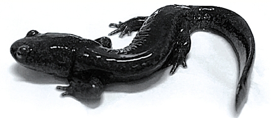 记者在吕一鸣家见到了夫妻俩都觉得像义乌小鲵的小东西。身长约11厘米,全身呈黑色,皮肤光滑无疣粒,身上分布有蓝色不规则小花点,腹部与全身肤色保持一致。体侧肋沟有10条,长有四肢,分别是两条前肢、两条后肢。后肢比前肢发达,前肢有四指,后趾有五个。身后长有一条偏平的尾巴。