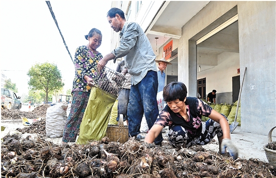 16日,在石柱镇塘花村的一个毛芋收购点,收购商和芋农正忙得不可开交。据介绍,因今年雨水较少,天气较干燥,毛芋收购价达3.4元每公斤,比去年高出一倍左右,该收购点每天能收1万公斤左右的毛芋。该村毛芋在8月5日开始收购,半个多月来,前来销售的芋农络绎不绝。 记者 杨成栋 摄