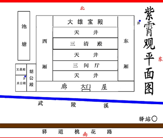 为更直观地了解紫霄观及其周围环境相互位置关系,看一看下面《紫霄观平面图》,就一目了然了。
