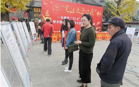 12月4日是我国第三个全国宪法日。当天,市司法局、市法院、市检察院和市公安局等单位在园周村举行“宪法走近你我”永康市“12.4”全国宪法日暨全国法制宣传日大型法律咨询活动,通过摆放法律知识展板、发放宣传资料、解答市民法律咨询、提供法律援助服务等形式,开展法律咨询和宣传活动。 记者 杨成栋 摄