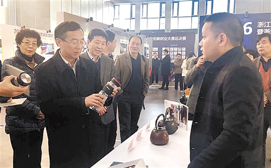省经信委主任张金如(左二)对我市“泡茶师”、手工铸铜壶等参赛产品赞不绝口。