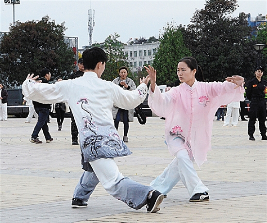 来自上海体育学院武术学院的学生刘智宇、王海霞还带来精彩的混合太极拳表演(见小图)。两人时而单飞,时而对练,男子的刚健与女子的柔美完美地融为一体,体现了太极阴阳交合的哲学寓意。我市太极拳爱好者也表演了太极功夫扇、陈式太极单刀、忽雷功夫架、推手组合、顶碗太极拳,精彩的表演赢得市民热烈的掌声。