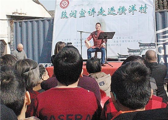 6日下午,“全面奔小康,永康新腾飞”的说唱声在唐先镇横洋村响起。由市委宣传部、市文广新局主办,市非遗保护中心、唐先镇人民政府承办的永康鼓词宣讲展演在此举行。郑繁荣、吕庭星等20位演唱者为在场一百多位村民献上了精彩的永康鼓词说唱表演。