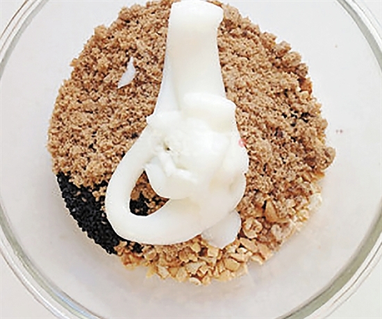 2、花生烤熟后去红衣,用擀面杖碾碎备用。