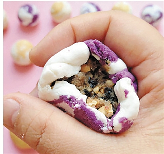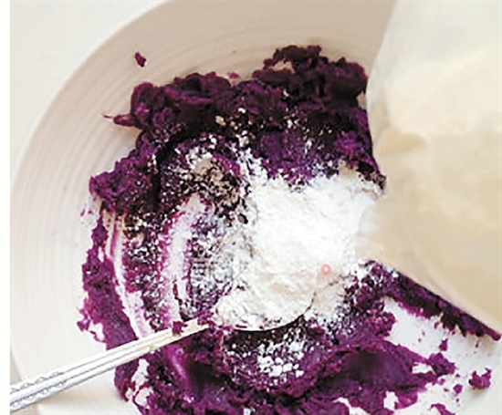 贴士:和糯米团的时候,因为紫薯和红薯所含水分不同,所以如果紫薯比较干的话可以适当加些清水。