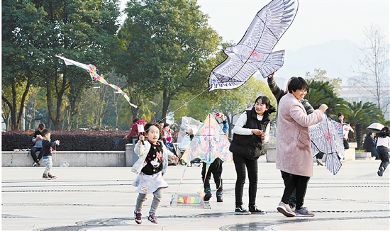 连日的晴好天气一扫之前的寒冷,不少市民带着孩子来到户外放风筝。26日,丽州广场的上空,形态各异的风筝争奇斗艳。 记者 杨成栋 摄