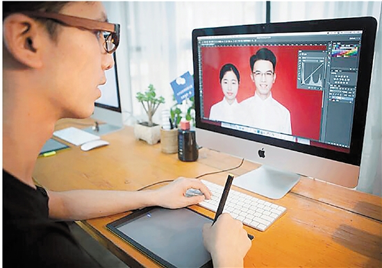 杨旭恒的摄影工作室位于溪心北区,面积不算大。记者走进工作室时,杨旭恒正在帮客人修图。他介绍:“客人需要化生活妆和挑选服装,我们拍好一个人的证件照,一般需要1个小时时间。拍完之后,我们会进行非常细致的精修,让他们满意为止。”