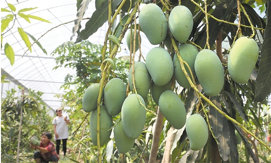 芒果、木瓜、荔枝……21日,记者在东城街道花解语玫瑰园的一座大棚内看到,这里长满了各种各样的热带水果。三年前,玫瑰园的负责人徐金永在种植火龙果的大棚内开出一块地,试验性种植热带水果,如今这些水果长势良好,其中一株芒果树上竟然挂了51个果实。试种的结果让徐金永很兴奋,他说,与外来的水果相比,本地种植的热带水果在运输和保鲜上占据市场竞争优势。