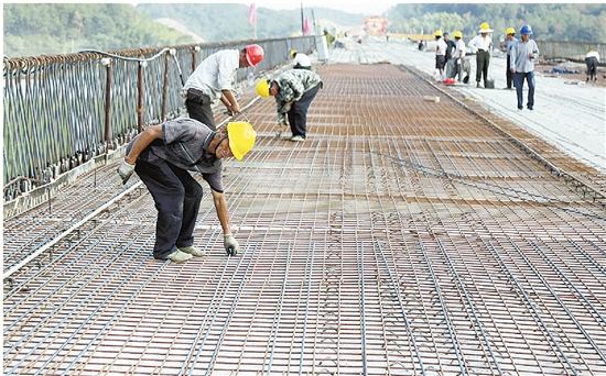 330国道永康段改建工程目前正在紧张建设中。22日,施工人员在东永高速公路分离桥上铺钢筋。分离桥工程今年年初动工,目前桥梁左侧已完成梁板铺设。 记者 林群心 摄
