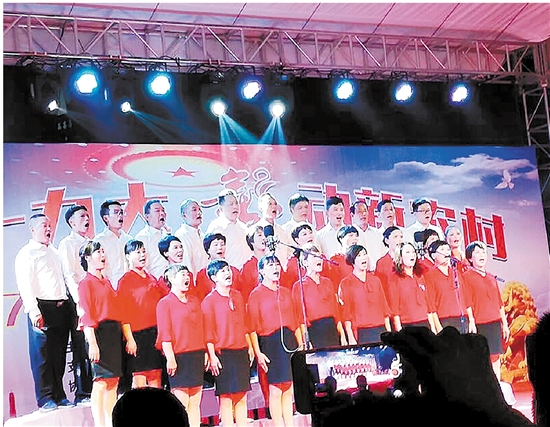 图为李二村党员干部献上的大合唱《我们走在大路上》。