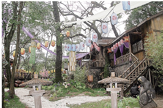 推开竹门,院内怒放的桃花、鲜花,一缕缕从高空飘落的紫色、粉色飘带垂于树梢,与周边悬挂于树上的古朴钻石灯、飘飞的黄罗伞、各式各样的五彩灯笼构成了唯美的世界。