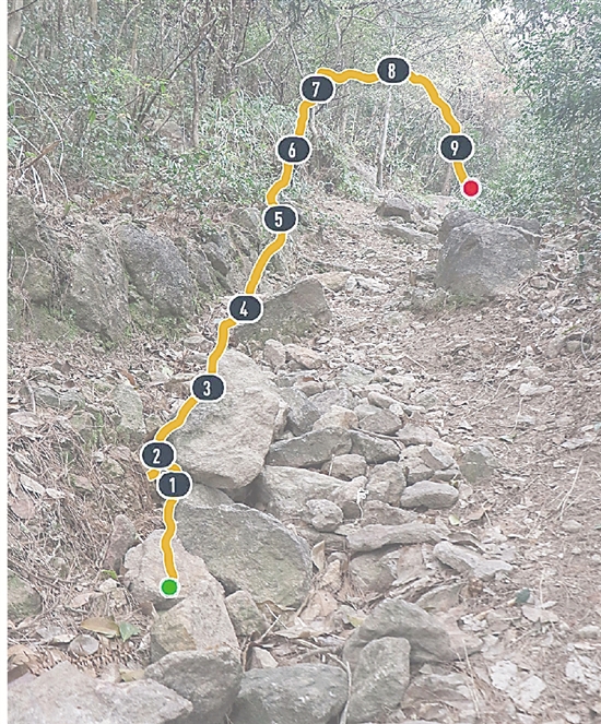 从陈弄坑东岩山山脚出发,记者一行向上行走。在出发前,有户外运动达人评价凉亭坑古道挑战难度为3颗星。出发才20分钟,记者就因为道路崎岖陡峭、再加上没有合理分配体力而远远落在后面,时不时停下来喘气休息。