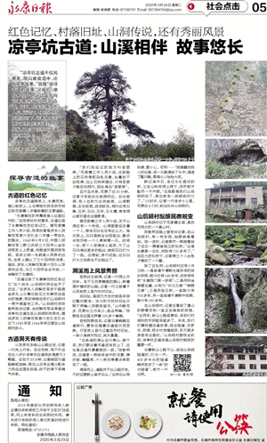 “凉亭坑古道不仅风景美,爬山难度适中,还有很多故事。”首篇“探寻古道的故事”见报后,便有多位户外运动达人向记者推荐了凉亭坑古道。近日,在花街镇工作人员、运动达人和当地村民的陪同下,记者从花街镇云川村陈弄坑自然村出发,开启了凉亭坑古道探险之旅。