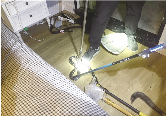 “我家来了一条毒蛇,请求帮忙。”12日22时15分,市先锋民防救援队接到恒丰路一位住户的求助。接到警情后,救援队召集蜂害蛇患处理小组队员火速赶往现场。