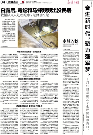 为什么这段时间蛇会如此频繁出没呢?余永贵表示,9月7日是二十四节气中的白露。这段时间蛇即将入洞冬眠,所以要外出觅食,因此出现比较频繁。民间又有谚语说“白露蛇,秋分蚊,恶过水牛公(公牛)”,就是提醒人们,白露前后蛇特别凶狠。