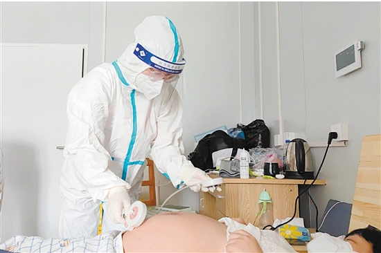 9月12日9时,市第一人民医院产科医生王笑盈和超声科医生程祎偲专程来到医学观察隔离服务点,做好防护后,携带B超机、胎心监护仪等设备,专门上门为吴女士做产检。在检查过程中,为了缓解吴女士的紧张情绪,王笑盈一边观察B超机的监测情况,一边和吴女士闲聊,教她判断胎儿胎心的频次,嘱咐她在隔离观察期间,合理饮食、适量活动。