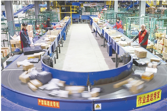 11月12日,工作人员在中国邮政集团有限公司衡阳邮区中心局邮件处理中心分拣快递包裹。