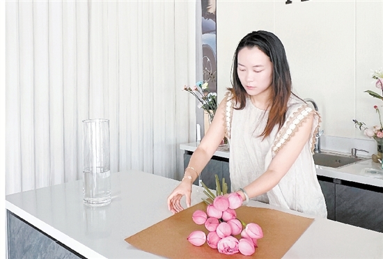 修剪、固定、用牛皮纸进行包装……在位于永康国际会展中心的纷华花艺,负责人王鸿钰正在精心制作一款简约又不失韵味的荷花花束。
