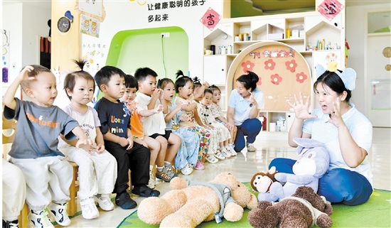 7月22日,在山东省滨州市博兴县金色摇篮幼儿园,老师带托育班的孩子做游戏。博兴县近年来聚焦“3岁以下婴幼儿照护”民生福祉,积极构建托育机构、社区嵌入式托育、幼儿园托班、用人单位办托相结合的“1+N”托育服务体系,为群众提供方便可及、价格可接受、质量有保障的普惠托育服务。