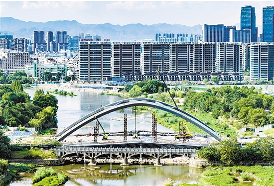 8月18日,记者在金水桥项目施工现场看到,3辆登高车上的工人正在对桥体进行打磨、喷漆作业。金水桥东起龙川东路,西至望江路,桥梁全长160米。项目工期为24个月。