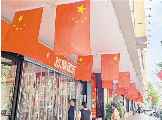 沿街商铺也纷纷通过悬挂国旗、贴上国庆主题装饰等方式,加入这场全民的节日庆祝中。在居民小区里,物业公司在大门和主要通道悬挂了国旗,让每一位居民都能感受到浓浓的节日气息。