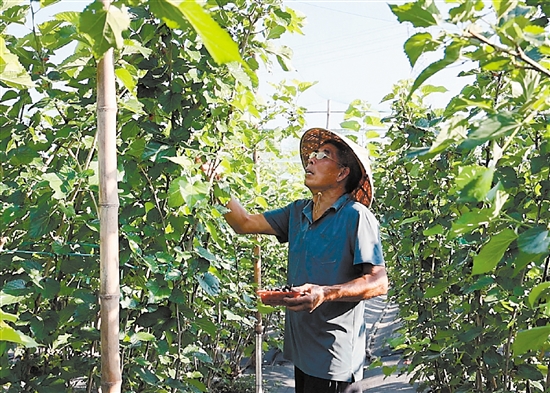 10月10日,在芝英镇熤欣家庭农场,种植户应生林正在采摘桑葚。据了解,为了实现桑葚秋季结果,该农场在今年8月中下旬开始对桑树进行科学管理,通过人工干预的方式打破了桑树的自然休眠周期,促使植株再次进入生长状态,从而成功实现桑葚一年两收。 融媒记者 曹润鑫 程卓一 摄