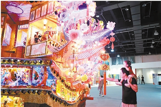 “繁花竞放”展区汇集了多位山花奖获奖艺术家的代表之作。由国家级非遗代表性传承人林顺奎制作的巨型乐清首饰龙成为该区域当之无愧的焦点,其内部精密的齿轮系统驱动着300余个绸塑人物演绎百态,令人叹为观止。