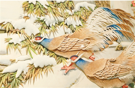 据了解,《盛世吉祥图——中国珍禽褐马鸡》是李卫东带领十余名中国堆花第十九代传承人,历时三年之久耗心血无数完成的力作。作品以生活在太行山的中国特有珍禽“褐马鸡”为主题,通过实地写生捕捉其四季形态,尤其突出其尾部翘起的独特姿态,象征昂扬斗志。在工艺上,作品融合各种丝绸锦锻、蚕丝、棉花、丝麻、硬纸板、矿物颜料、通草、棕榈等多种材料,以“层层堆叠”的技法塑造出立体生动的画面效果。李卫东介绍,“堆花”技艺起源于唐代,历史上曾为宫廷造办所用,1915年在巴拿马万国博览会上荣获银奖,驰名国际,如今堆花工艺已传播至俄罗斯、日本等地,成为极具国际影响力的中国传统工艺。