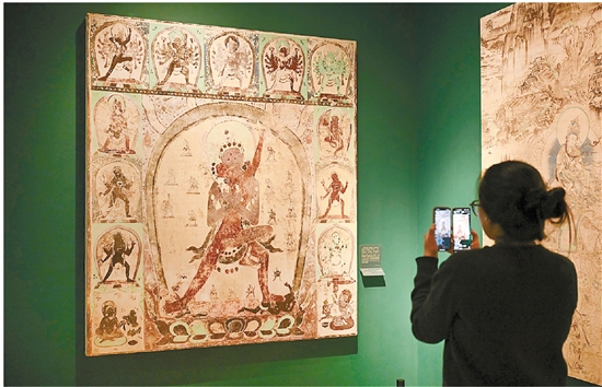 10月23日,“何以敦煌·念念回响”敦煌文化艺术公益展在上海艺丰中心举办,展览包括“千窟梵境”“惊世发现”“守护传承”“星河绵延”四部分,将持续至2026年3月31日。 新华社记者 陈浩明 摄