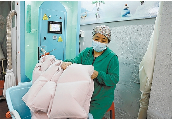 “先看绒的好坏,拆绒后醒绒、蓬松,再经过三遍过滤、三遍消毒,充好被子后还要臭氧消毒半小时,制作一床被子至少要3个小时。”商户陈永芬详细介绍了改造流程。