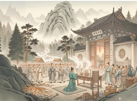 全诗以“除虎安民”为主线,首联“虎啸寒”“路行难”渲染危机,颔联“暗施陷阱”显智谋、“虔祷城隍”寓仁心,颈联“死虎当庭”“复市安澜”写治理实效,尾联“庙祀传仁政”升华至德政传承。于叙事中见智勇,于质朴中显深情,经典刻画胡则的“仁政惠民”。