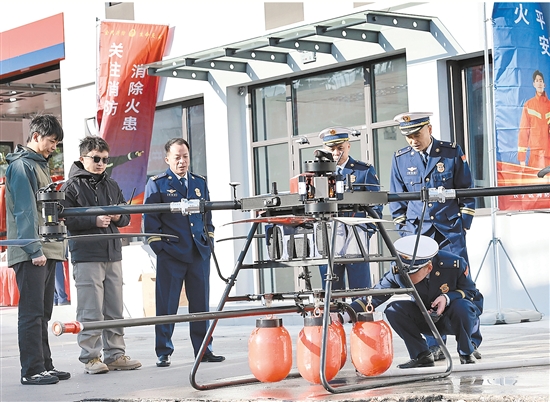11月18日,上海市长宁区消防救援局打造的消防安全主题巴士,在双流路消防救援站正式发车,消防无人机、高压水炮机器狗等新型消防救援设备也在发车活动现场亮相,助力消防宣传月主题活动。图为消防员在活动现场查看消防无人机下方挂载的红色灭火弹。