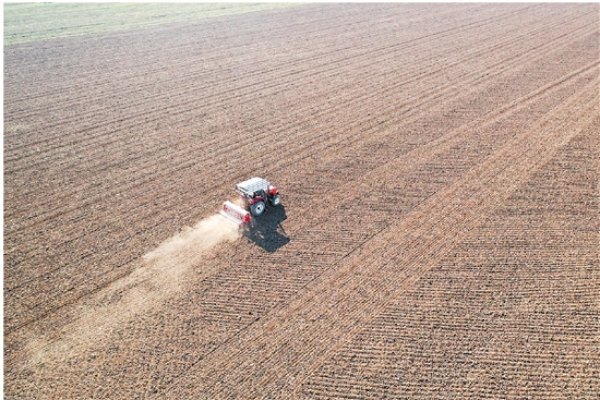 记者11月19日从农业农村部获悉,据农情调度,截至11月18日,全国冬小麦播种过九成,其中黄淮海近九成半。图为河南省沁阳市王曲乡古章村农民驾驶农机播种小麦。 新华社发(杨帆 摄)