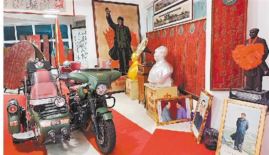 在红色收藏展览馆内,展出上千件老物件。种类包括毛主席像章、铝制巨型红色徽章、历年党史教育挂图,以及20世纪80年代生产的收音机、电视机等。