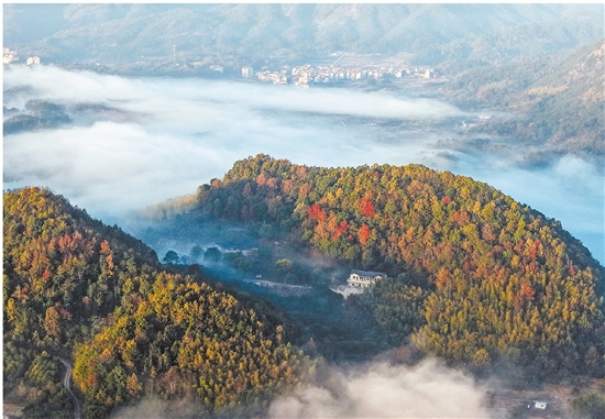 12月1日清晨,在舟山镇东风村,平流雾如轻纱般在群山之间徐徐铺展,将寻常烟火人家晕染成云上风景。