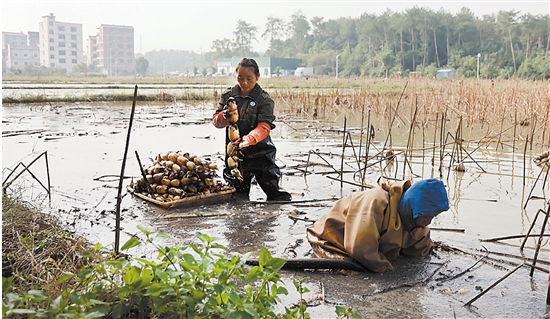 莲藕迎来了集中采挖期。12月2日,在西城街道上溪塘村,藕农方成夫妇正在其承包的50多亩藕田进行采挖。据悉,这些藕田亩产约2500公斤。 融媒记者 胡东来 摄