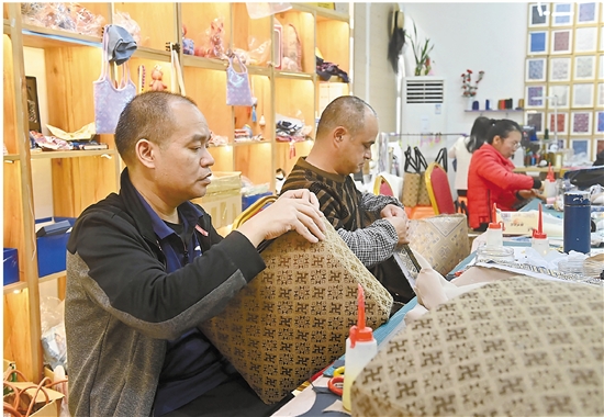 广西宾阳县有着悠久的壮锦生产历史。近年来,该县在传统壮锦生产的基础上,积极推动壮锦文创产业发展,拓宽了当地劳动就业渠道。图为12月17日,在广西宾阳壮锦文创馆,工人制作壮锦文创产品。 新华社记者 陆波岸 摄