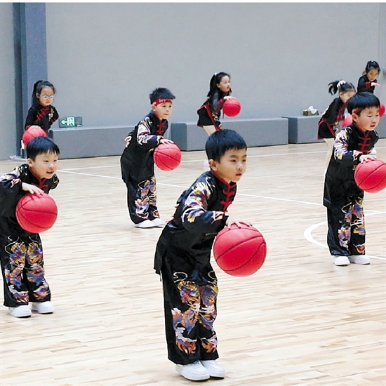 音乐响起,小朋友们首先围成一圈,模仿龙的形态。伴随着节奏动感的音乐,小演员们身着统一的国风服饰,个个精神抖擞。他们双手持球,跟着节奏整齐踏步、转身、运球,篮球在他们的掌心和指尖跳跃。