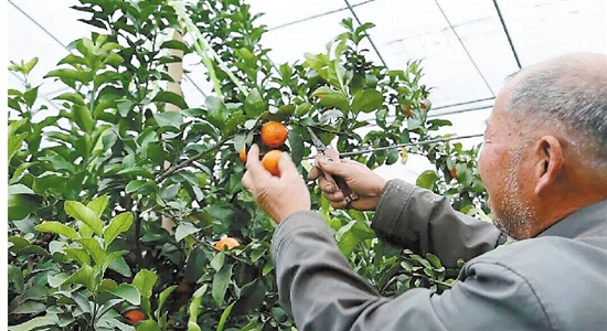 果农陈樟高正在采摘成熟的金秋砂糖橘。在他的精心管理下,今年橘树平均产量每棵25公斤左右,单棵产量最多达50多公斤。